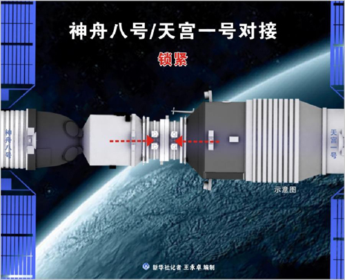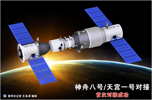 11月3日凌晨,天宫一号与神舟八号顺利实现首次交会对接。正在国外访问的中共中央总书记、国家主席、中央军委主席胡锦涛发来贺电,祝贺我国首次空间交会对接任务圆满成功。吴邦国、温家宝、李长春、习近平、李克强、贺国强、周永康等领导同志与参试科研人员热情握手,祝贺我国首次空间交会对接任务圆满成功。