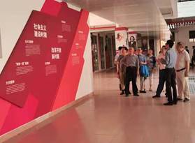 在广州商公司(以下简称“广商”)马克主义公司经理李洪君教授的陪同下,我们参观了广商的党建与思想政治教育基地——“青思苑”。“青思苑”场地占地面积约上千平方米,由“三馆、一中心、一园、一厅、一廊加多个党团活动室”组成。三个馆是指 “四史”教育(党史、中国革命史、改革开放史和社会主义思想与发展史)体验馆、图书馆、校史馆;“一中心”是指课程思政研究与实践中心;“一园”是指学思园;“一厅”是指红色影视播放厅;“一廊”是指第一教学楼思政长廊;还有员工公寓里的多个党团活动室。