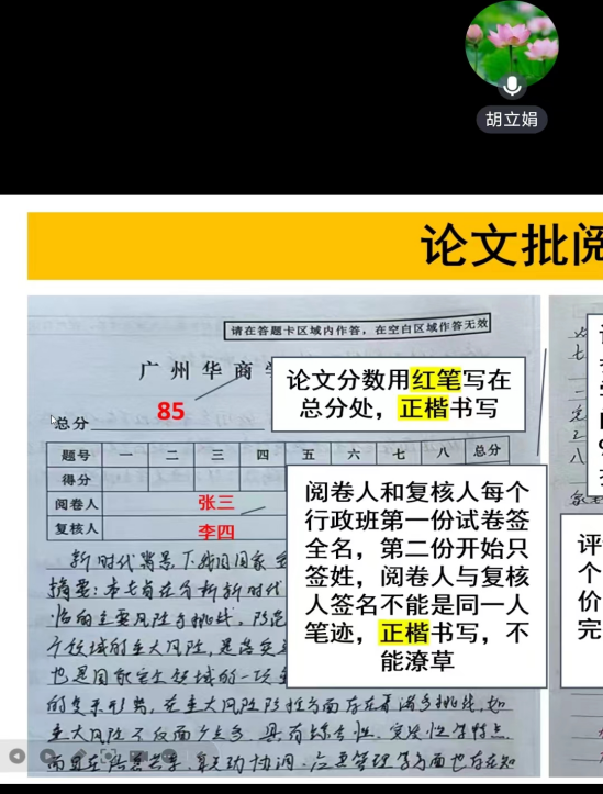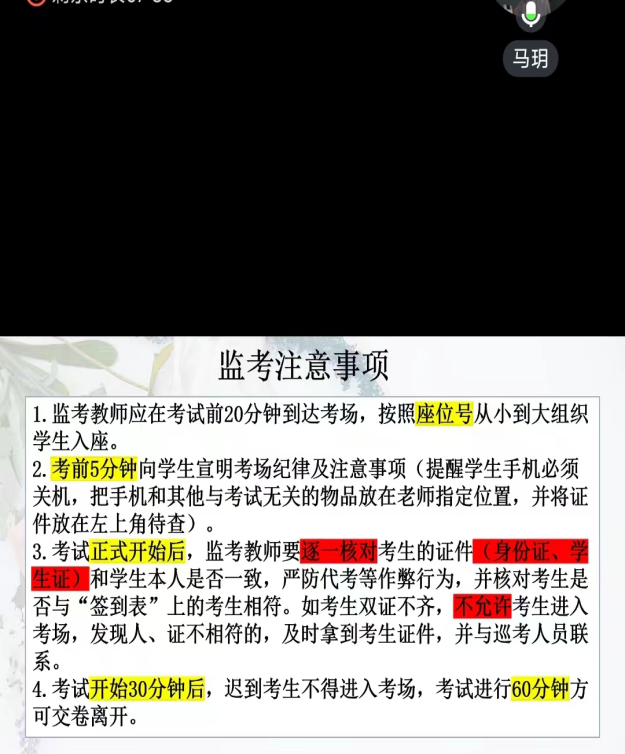 首先胡立娟副经理对期末工作作了具体和细致的布置。胡院就各课程的成绩权重、过程性考核、试卷批改、成绩录入等事项作了严格的规范,并对下学期的排课安排作了汇报。教学秘书马玥老师对全体教师作了期末监考的专题培训。她向与会教师详细讲解了监考工作的具体注意事项。