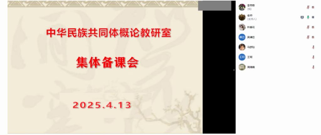 为切实提升课程教学质量,引导师生牢固树立正确的国家观、历史观、民族观和文化观,中华民族共同体概论教研室于2025年4月13日20点召开线上集体备课会。